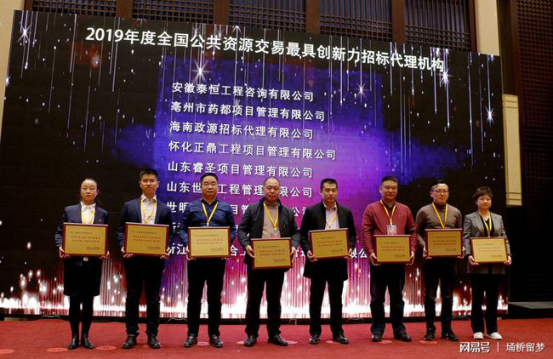 作为本次年会的一项重要议程,6日下午举行了年度“公共资源交易奖项”颁奖盛典,奖项共包括:2019年度全国公共资源交易优秀监管机构、2019年度全国十佳公共资源交易中心(省级、市级、区县级)、2019年度全国公共资源交易改革先锋人物、2019年度公共资源交易优秀供应商、2019年度全国公共资源交易十佳业务能手、2019年度全国公共资源交易十佳示范项目、2019年度全国公共资源交易最具创新力招标代理机构、2019年度全国公共资源交易科技成果大赛综合类等23个奖项。山东睿圣项目管理有限公司经过组织推荐、网络投票、专家评选,最终脱颖而出,与其他七家单位一起共获“2019年度全国公共资源交易最具创新力招标代理机构”殊荣。