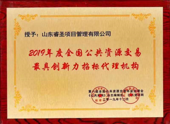 2020年2月4日至6日,2019全国公共资源交易年会暨全国公共资源交易奖项颁奖盛典在北京举行,来自全国20余个省(自治区、直辖市)的公共资源交易监管机构及中心代表、行业专家、知名企业代表等300多位嘉宾参加了年会及颁奖仪式。会上,山东睿圣项目管理有限公司荣获“2019年度全国公共资源交易最具创新力招标代理机构”,据悉,全国仅八家单位荣获此项盛誉。